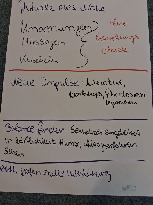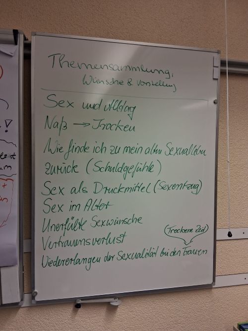 In der folgenden Kleingruppenarbeit machten wir uns Gedanken über Rollenbilder und Erwartungen bei Männern und Frauen. Wir diskutierten, was sich die Partner wünschen könnten, was beim Sex schiefgehen kann und was sich künftig ändern sollte. Die Auswertung der Frage, was passieren könnte, wenn Mann und Frau die Körper tauschen, löste allgemeine Heiterkeit aus. Trotzdem wurde die Frage letztlich mit der notwendigen Ernsthaftigkeit bearbeitet. Die meiste würden sich für die erogenen Zonen der Frau interessieren und wie Frauen den Sex erleben.